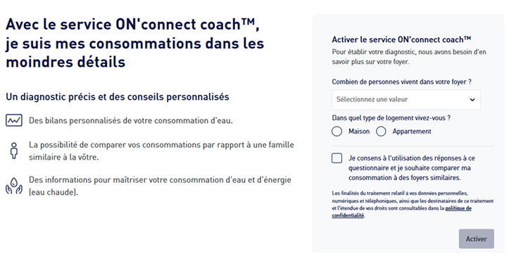 Illustration du site www.Toutsurmoneau.fr lors de l’activation du service On’connect coach :