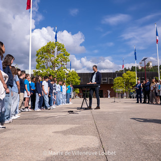 En présence de M. le Maire Lionnel Luca et des élus du Conseil Municipal, la commune de Villeneuve Loubet a célébré la Journée de l’Europe, marquée par le 75ème anniversaire de la Déclaration de Robert Schuman du 9 mai 1950, et du 70ème anniversaire du drapeau européen. Sur le parvis de l’Europe, à proximité de la stèle Simone Veil, 1ère Présidente du parlement européen, des élèves du collège Romée de Villeneuve ont entonné de bleu vêtus l’hymne européen, sous la conduite musicale de Quentin Benayoun, professeur de musique. En présence de Leïla Cutaya, Principale Adjointe, et d’Anne-Sophie Trasbot, Professeur d’Histoire-Géographie, Ils ont dans la foulée déclamé un poème porteur de paix et d'espoir : "de faire de l'Europe un lieu pour grandir".